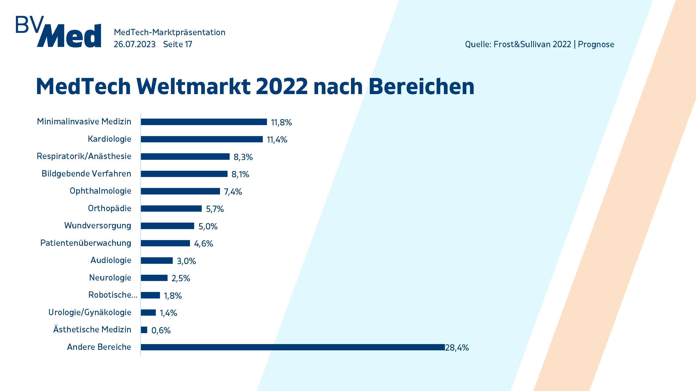 68 Prozent des Umsatzes der MedTech-Branche von über 40 Milliarden Euro gehen in den Export. Werden Kleinbetriebe mitgerechnet, sind es sogar mehr als 55 Milliarden Euro. Deutschland ist derzeit noch der zweitgrößte Medizintechnik-Standort der Welt – nach den USA, vor Japan und China. Die Medizintechnik benötigt einen attraktiven Standort Deutschland, um weiterhin im internationalen Kontext wettbewerbsfähig zu sein.