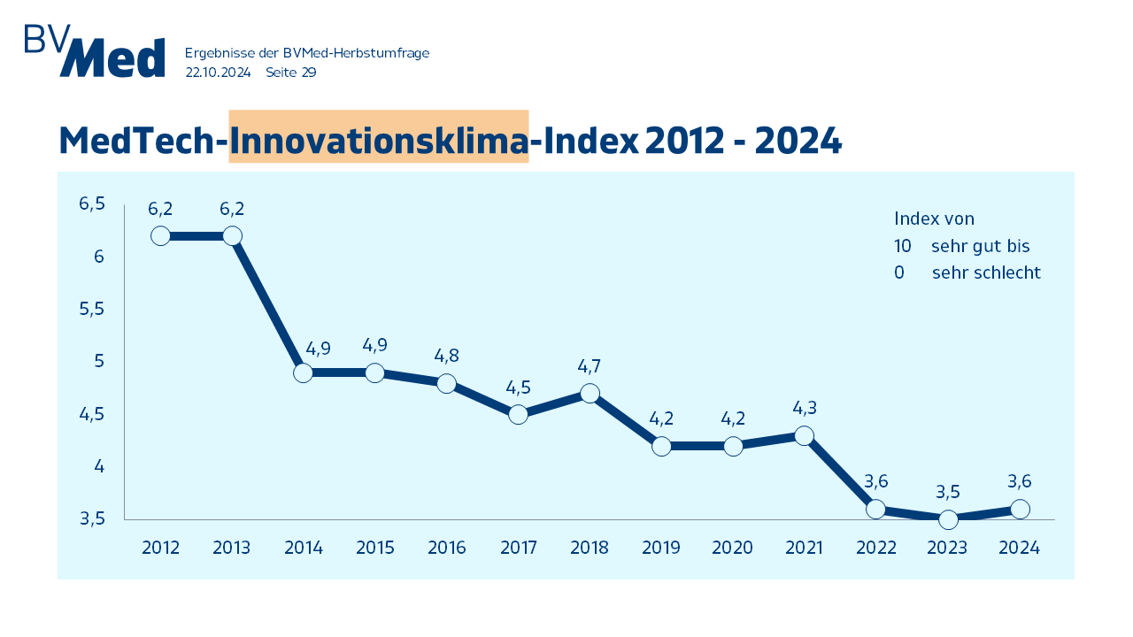 Auf einer Skala von 0 (sehr schlecht) bis 10 (sehr gut) bewerten die Unternehmen das Innovationsklima für Medizintechnik in Deutschland im Durchschnitt mit 3,9. Das ist eine leichte Verbesserung gegenüber dem absoluten Tiefstwert aus dem Jahr 2023.