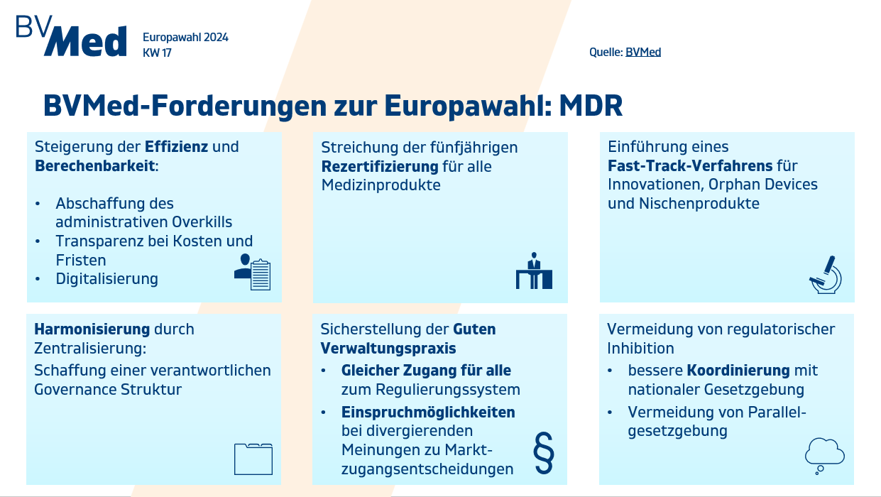 Am 9. Juni wird ein neues Europaparlament gewählt. Dazu hat der BVMed ein Positionspapier veröffentlicht. Dieses finden Sie hier Externer Link. Öffnet im neuen Fenster/Tab.. In dieser Infografik finden Sie die Forderungen des BVMed zur MDR.