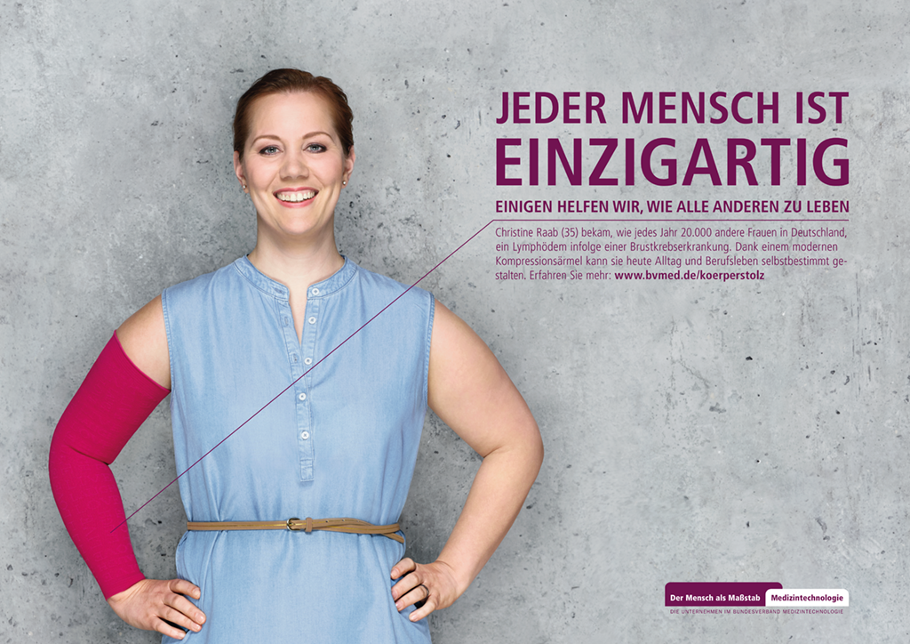 Christine Raab (35) bekam, wie jedes Jahr 20.000 andere Frauen in Deutschland, ein Lymphödem infolge einer Brustkrebserkrankung. Dank einem modernen Kompressionsärmel kann sie heute Alltag und Berufsleben selbstbestimmt gestalten. Als Protagonistin der BVMed-Kampagne „Körperstolz“ will sie mit ihrer positiven Einstellung anderen Betroffenen Mut machen. Die Plakate mit Christine sind derzeit mitten in Berlin und am Flughafen Tegel zu sehen.