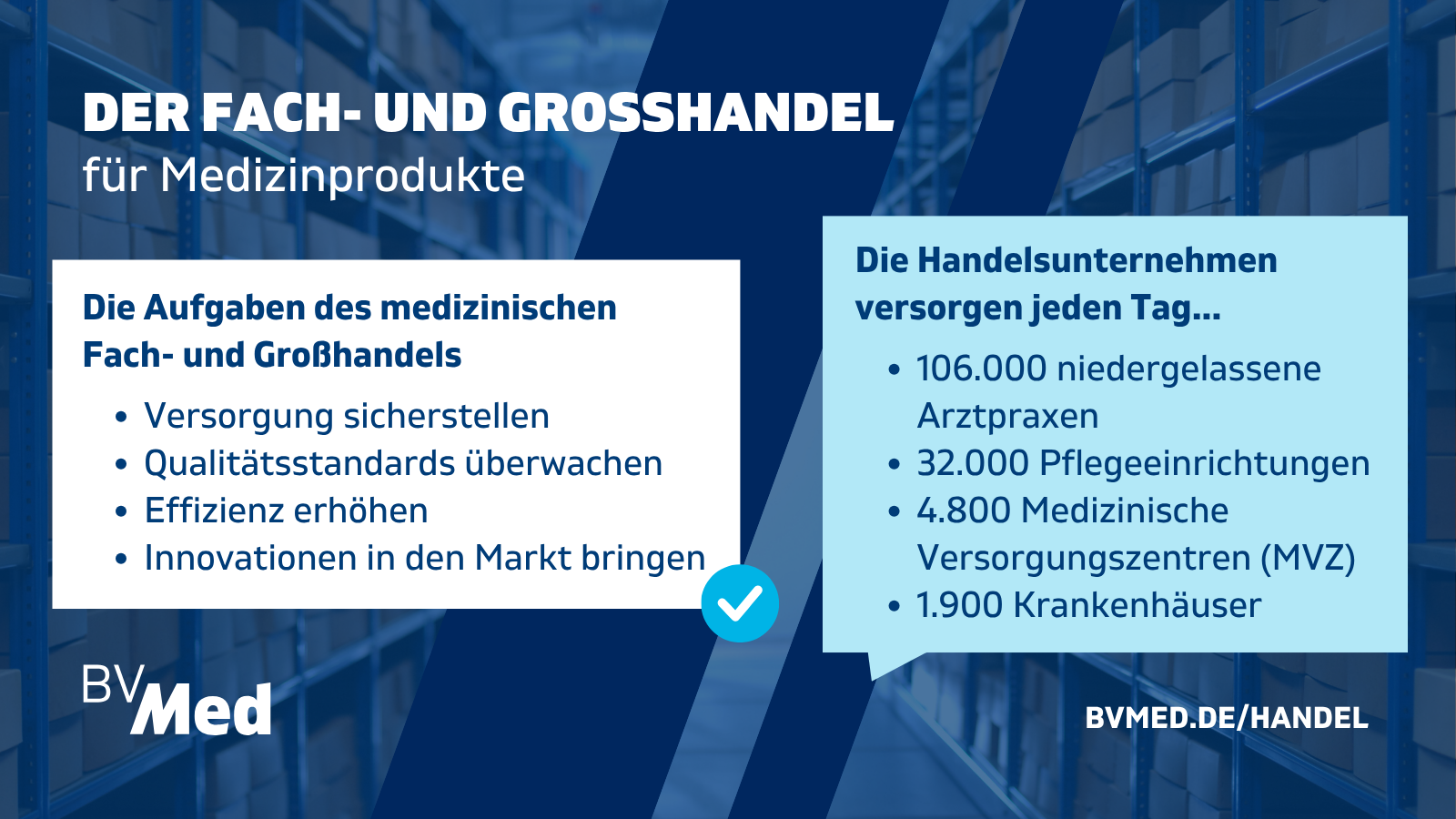 Der Fach- und Großhandel für Medizinprodukte ist eine wesentliche Säule der Gesundheitsversorgung in Deutschland: Er sicher, dass die benötigten Produkte rechtzeitig, am benötigten Ort und in der richtigen Qualität zur Versorgung von Patient:innen bereitstehen.