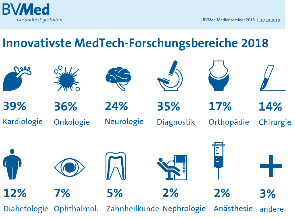 Als innovativsten Forschungsbereich schätzen die Unternehmen – wie im Vorjahr – die Kardiologie ein. 39 Prozent der Befragten nennen diesen Versorgungsbereich. Es folgen Onkologie (36 Prozent), Diagnostik (35 Prozent), Neurologie (24 Prozent) und Orthopädie (17 Prozent).
