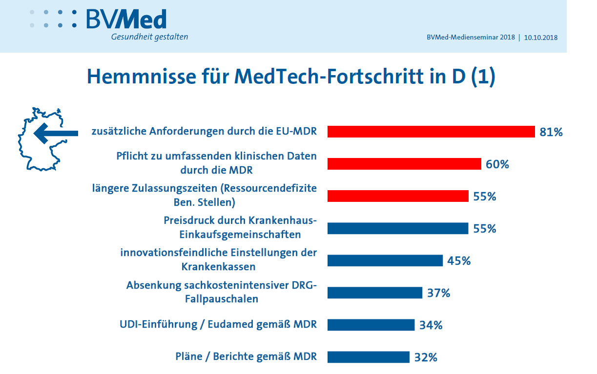 Als größtes Hemmnis für die künftige Entwicklung der Medizintechnologie-Branche sehen die Unternehmen die gestiegenen Anforderungen und die steigenden Kosten durch die neue EU-Medizinprodukte-Verordnung (MDR) sowie Engpässe bei den Benannten Stellen an. Als Folge der MDR-Implementierung befürchten zwei Drittel der Unternehmen, dass Produkte aus ökonomischen Gründen vom Markt genommen bzw. nicht auf den Markt gebracht werden – und darunter auch die Patientenversorgung leiden wird.