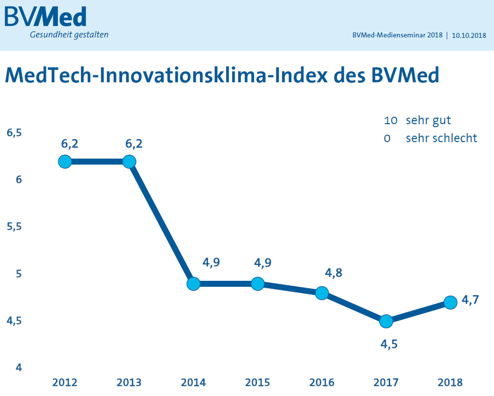 Auf einer Skala von 0 (sehr schlecht) bis 10 (sehr gut) bewerten die Unternehmen das Innovationsklima für Medizintechnik in Deutschland im Durchschnitt mit 4,7. Der Index entwickelt sich damit erstmals seit dem „Absturz“ 2015 wieder leicht nach oben. In den Jahren 2012 und 2013 lag er noch bei 6,2 Punkten.