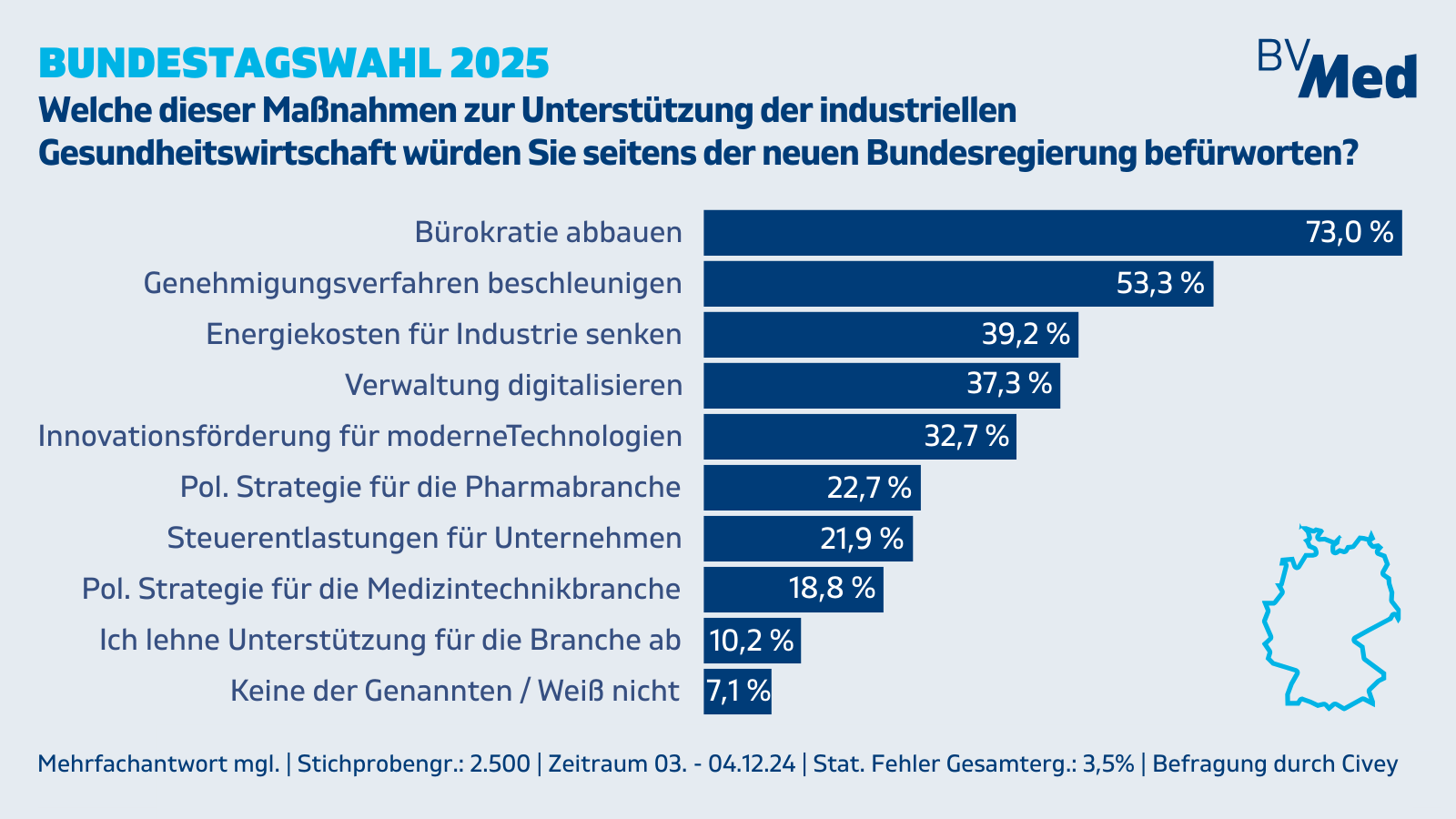 90 Prozent der Deutschen sprechen sich für eine bessere Unterstützung der industriellen Gesundheitswirtschaft durch die neue Bundesregierung aus. Das ergab eine repräsentative Befragung des Meinungsforschungsunternehmens Civey im Auftrag des Bundesverbandes Medizintechnologie (BVMed). An erster Stelle der konkreten Maßnahmen stehen Bürokratieabbau, beschleunigte Genehmigungsverfahren, sinkende Energiekosten, digitalisierte Verwaltung und eine bessere Innovationsförderung für moderne Technologien. „Der Wirtschaftsstandort Deutschland verliert im internationalen Wettbewerb an Boden. Wir müssen die Attraktivität des Standorts steigern und die Rahmenbedingungen insbesondere für die Schlüsselbranche Gesundheitswirtschaft verbessern, um Vertrauen für Investitionen zurückzugewinnen. Dafür hat die Bevölkerung ein gutes Gespür“, kommentiert BVMed-Geschäftsführer und Vorstandsmitglied Dr. Marc-Pierre Möll.