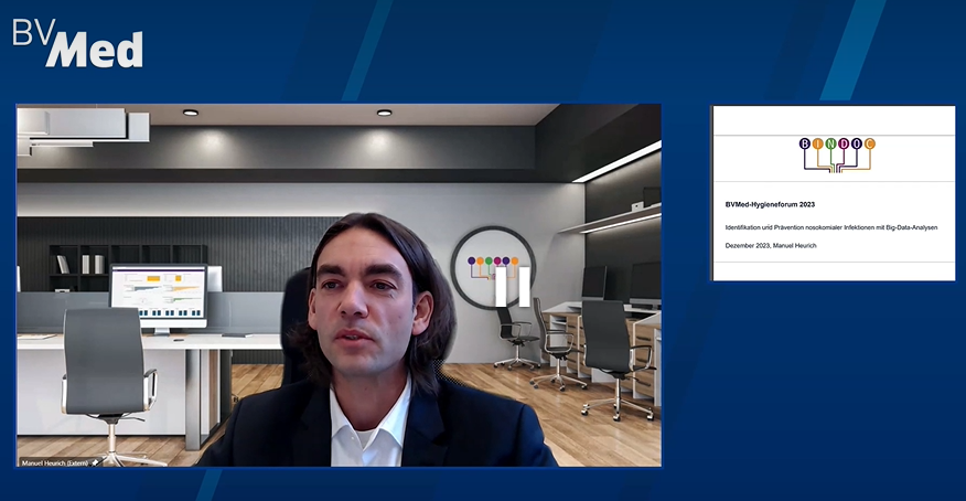 BinDoc-Geschäftsführer und Datenexperte Dr. Manuel Heurich ging auf die Identifikation und Prävention nosokomialer Infektionen mit Big-Data-Analysen ein. Grundsätzlich steige die Nachfrage nach „Real World Evidence“, also der Ergänzung interventioneller klinischer Studien durch Daten aus dem Versorgungsalltag. Hier gebe es eine zunehmende Anerkennung in der wissenschaftlichen Welt mit einer kostengünstigen Alternative zu interventionellen Studien. BinDoc vernetzt dabei öffentlich zugängliche Quellen wie Qualitätsberichte der Krankenhäuser, Zahlen des DRG-Instituts InEK oder statistische Bundes- und Landesämter zu Big Data in einer Forschungsdatenbank. Aktuell stellen bereits über 300 Kliniken detaillierte Daten zu 17 Millionen Fällen zur Verfügung. Jedes Jahr kommen über 30 neue Kliniken hinzu, sodass Kliniken und einzelne Abteilungen in einem webbasierten Analysetool beispielsweise bei Infektionsraten verglichen werden können. So kann sich die Klinik schnell einordnen und aufgeschlüsselt nach Infektionsarten Optimierungspotenzial ermitteln. Bei „Surgical Site Intefections (SSI)“ identifiziert der BinDoc-Algorithmus mittlerweile eine ähnliche SSI-Rate wie die KISS-Surveillance. „Dies ist ein großer Meilenstein, da unsere Analyse nicht auf Stichproben, sondern der Gesamtdatenbasis durchgeführt wird und vollautomatisiert erfolgt“, so Heurich. „Wir sehen in dieser Art von Tools das volle Potenzial der Digitalisierung. Die Nutzung von Big Data ermöglicht uns eine branchenweit außergewöhnliche Sicht auf klinische Ergebnisse und deren ökonomische Auswirkungen.“