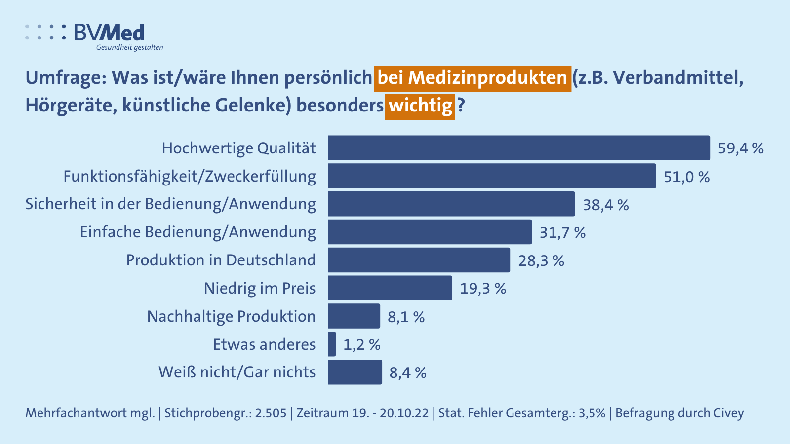 Auf die Frage „Was ist / wäre Ihnen persönlich bei Medizinprodukten (z.B. Verbandmittel, Hörgeräte, künstliche Gelenke) besonders wichtig?“ nannten 59,4 Prozent der Deutschen das Qualitätskriterium als wichtigen Aspekt. 51 Prozent nannten das Kriterium „Funktionsfähigkeit und Zweckerfüllung“, gefolgt von 38,4 Prozent für „Sicherheit in der Bedienung und Anwendung sowie 31,7 Prozent für „Einfache Bedienung und Anwendung“. Immerhin 28,3 Prozent ist eine Produktion in Deutschland wichtig, dagegen nur 19,3 Prozent „Niedrig im Preis“ und 8,1 Prozent eine „Nachhaltige Produktion“.