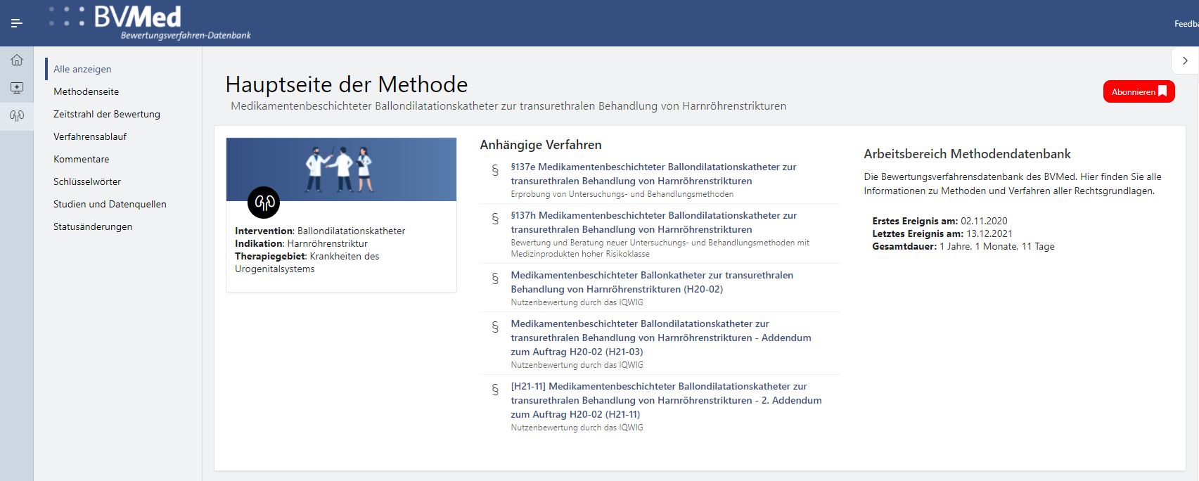 Ein Methodenverfahren erfordert die Teilnahme vieler unabhängiger Institute. Hier ist allerdings die Kommunikation der Untersuchungsergebnisse und Beschlüsse nicht einheitlich geregelt. Einen vollständigen Überblick über die Methodenbewertung und Analysen gibt die herstellerorientierte digitale Bewertungsverfahren-Datenbank „BVData“ des BVMed. Dort werden Verfahren von der Eröffnung bis zur abschließenden Bewertung strukturiert hinterlegt. Mit den vollständig recherchierbaren Datensätzen zur Erprobung und Bewertung von Medizinprodukten können Medizintechnik-Unternehmen alle Daten schnell und aussagekräftig analysieren. Damit ist die BVMed-Datenbank die erste ihrer Art und für alle Unternehmen geeignet, die ein Medizinprodukt in Verkehr bringen oder gebracht haben und in die Regelversorgung der GKV aufgenommen werden wollen.