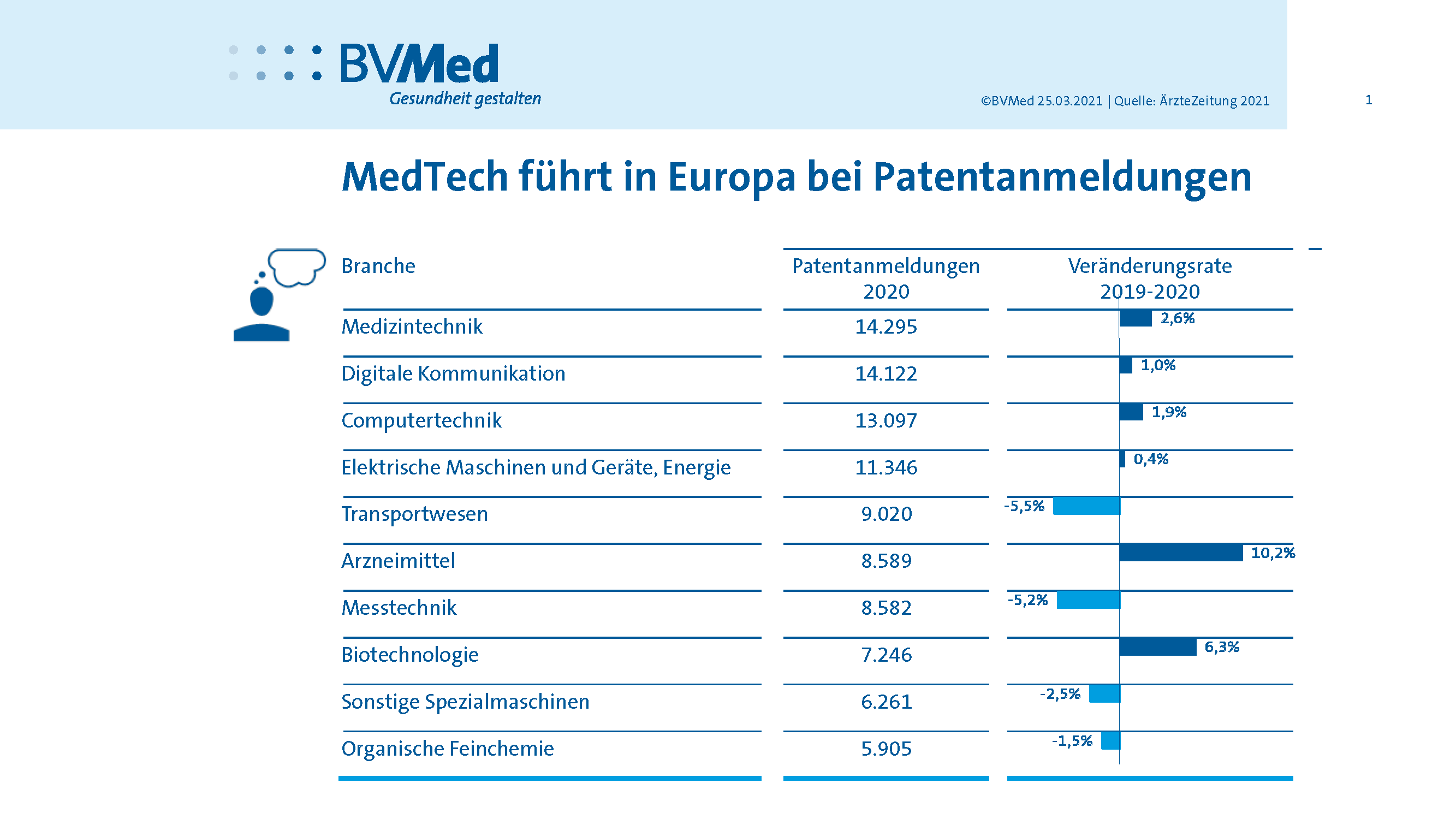 Die Gesundheitswirtschaft ist in den letzten zehn Jahren mit Ausnahme des Pandemiejahres 2020 beständig gewachsen. 2021 erbrachte sie 391,8 Milliarden Euro an Wertschöpfung. Das entspricht 12,1 Prozent der Bruttowertschöpfung in Deutschland. Gerechnet auf einen Tag sind das mehr als 1 Milliarde Euro Bruttowertschöpfung. Im Jahr 2021 generierte die Herstellung von Medizinprodukten und Medizintechnik eine Bruttowertschöpfung von 15,4 Milliarden Euro. Im Vergleich zum Krisenjahr 2020 hat die Branche damit wieder leicht zugelegt.