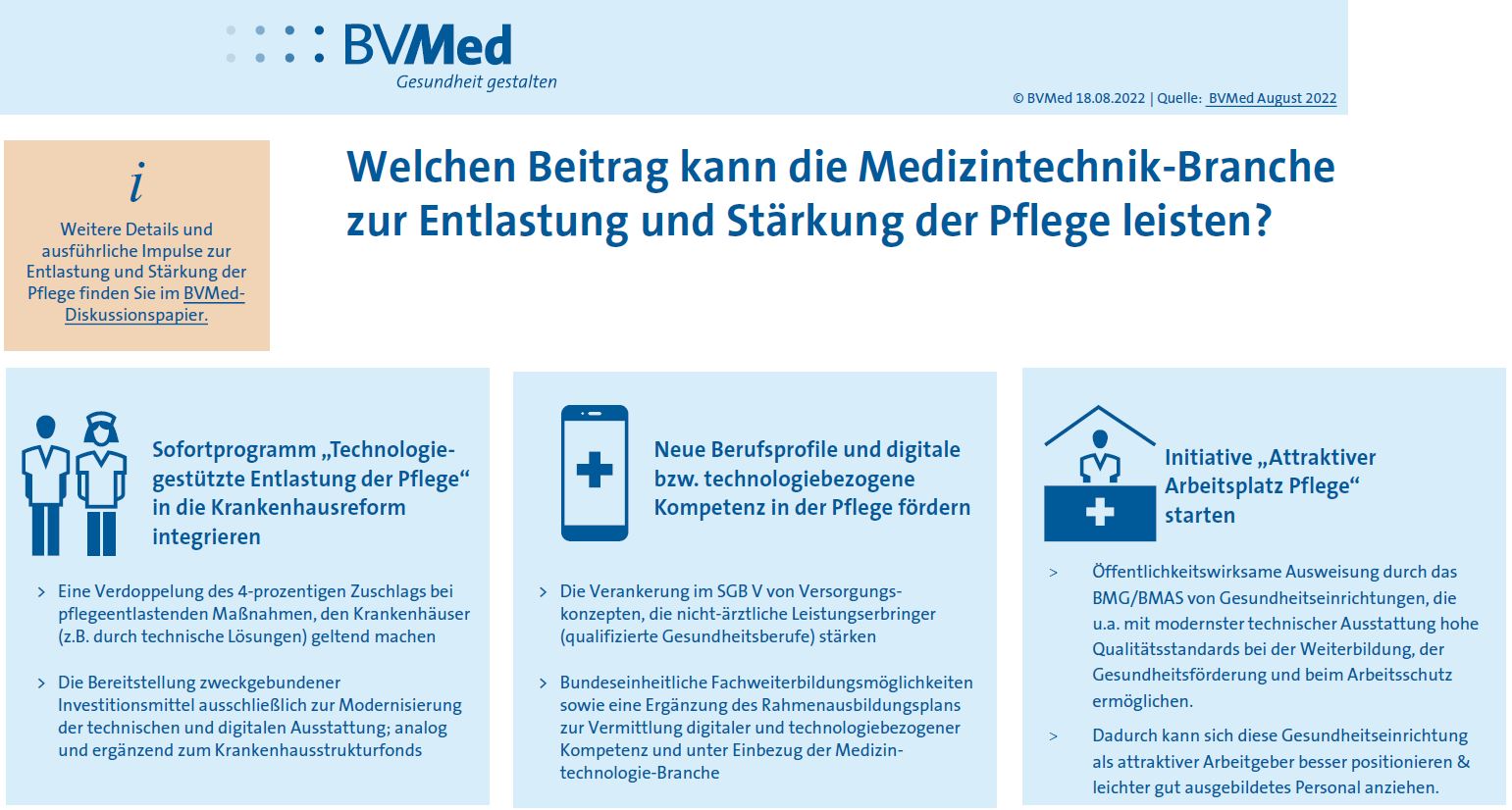 Es besteht breiter Konsens, dass das Berufsfeld Pflege attraktiver gestaltet werden muss. Dabei bietet die Medizintechnik-Branche viele Lösungen zur Unterstützung, Entlastung und Stärkung der Pflege. Medizinprodukte und digitale medizintechnologische Lösungen können dabei helfen, Arbeitsprozesse zu verbessern, Ressourcen zu schonen und Arbeitsrisiken zu reduzieren. Gleichzeitig ist dadurch eine Erweiterung der Kompetenz- und Tätigkeitsbereiche in der Pflege möglich. Mehr in diesem Themenportal.