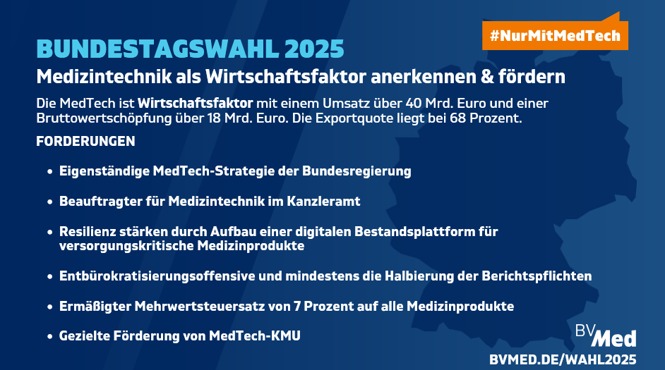 Um die Rahmenbedingungen für die MedTech-Branche zu stärken, Innovationen zu fördern und die Gesundheitsversorgung effizienter zu gestalten, fasst der BVMed in einem Positionspapier zur Bundestagswahl 2025 einen 10-Punkte-Plan zusammen. Unsere Kernforderung an die neue Bundesregierung: eine eigenständige MedTech-Strategie mit einem ressortübergreifend abgestimmten Maßnahmenplan. Auf dieser Seite finden Sie das gesamte Positionspapier zum Durchlesen und Herunterladen.