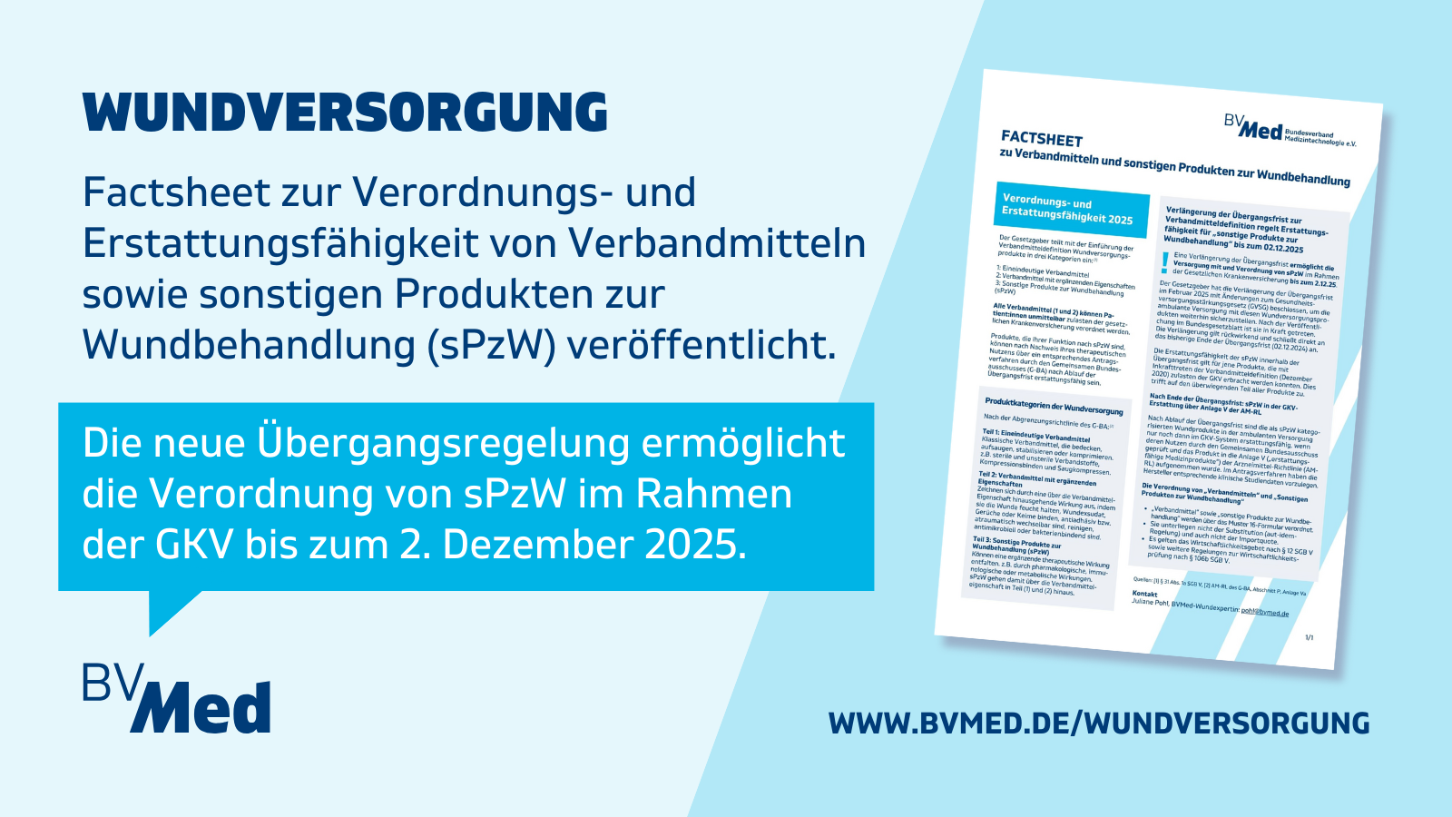Nach der Veröffentlichung des Gesundheitsversorgungs-Stärkungsgesetzes (GVSG) im Bundesgesetzblatt tritt die Verlängerungsregelung für „sonstige Produkte zur Wundbehandlung (sPzW)“ rückwirkend zum 2. Dezember 2024 in Kraft. Darauf weist der BVMed hin und informiert mit einem neuen Infoblatt über die aktuell geltenden Regelungen zur Verordnung und Erstattung von Verbandmitteln.