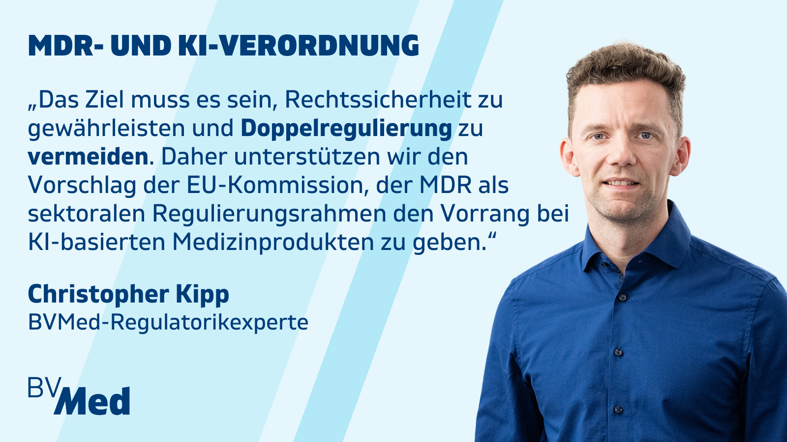 Der BVMed unterstützt in einem Positionspapier zum „KI-Omnibus“ den Vorschlag der EU-Kommission, der EU-Medizinprodukte-Verordnung (MDR) als sektoralen Regulierungsrahmens den Vorrang bei KI-basierten Medizinprodukten zu geben. „Das Ziel muss es sein, Rechtssicherheit zu gewährleisten und doppelte Reglungen zu vermeiden“, so BVMed-Experte Christopher Kipp vor dem Hintergrund der anstehenden Entscheidung im EU-Parlament.
