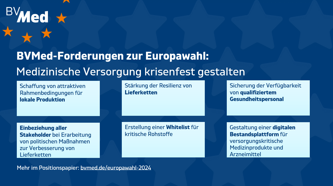 Am 9. Juni wird ein neues Europaparlament gewählt. Dazu hat der BVMed ein Positionspapier veröffentlicht. Dieses finden Sie hier Externer Link. Öffnet im neuen Fenster/Tab.. In dieser Infografik finden Sie die Forderungen des BVMed zur MDR.
