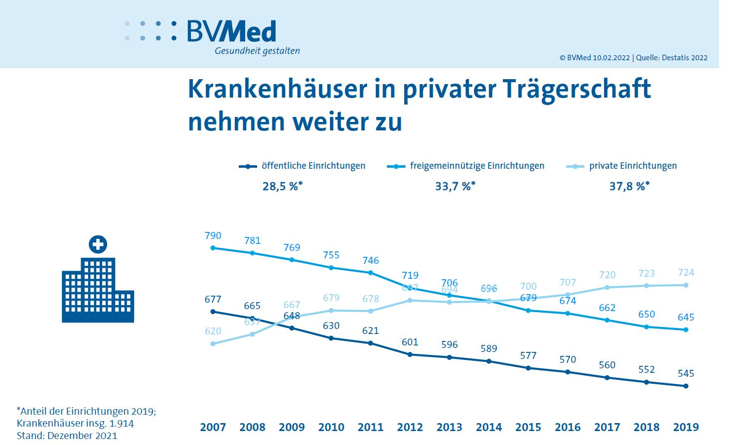 Krankenhäuser in privater Trägerschaft nehmen weiter zu. Unter der Trägerschaft versteht man jede natürliche oder juristische Person, die ein Krankenhaus betreibt. Es gibt drei unterschiedliche Arten von Trägerschaften.