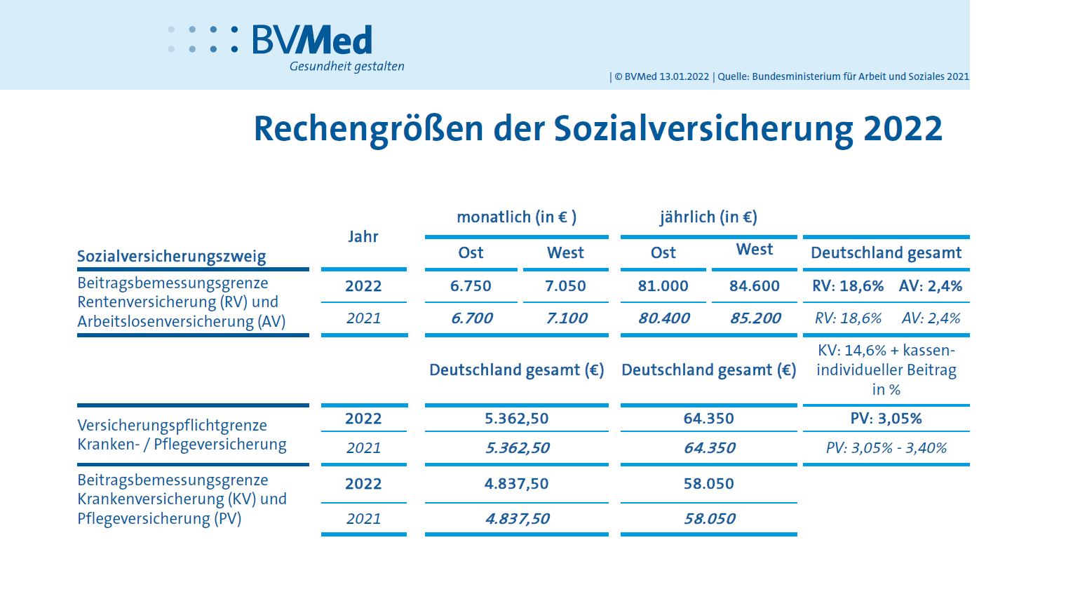 Jedes Jahr werden die Beitragsbemessungsgrenzen in der gesetzlichen Kranken- und Rentenversicherung entsprechend der Einkommensentwicklung angepasst. Die neue Sozialversicherungs-Rechengrößenverordnung 2022 ist am 1. Januar in Kraft getreten. Im Bereich der Krankenversicherung sind die Pflichtversicherungsgrenze und die Beitragsbemessungsgrenze gleich geblieben.