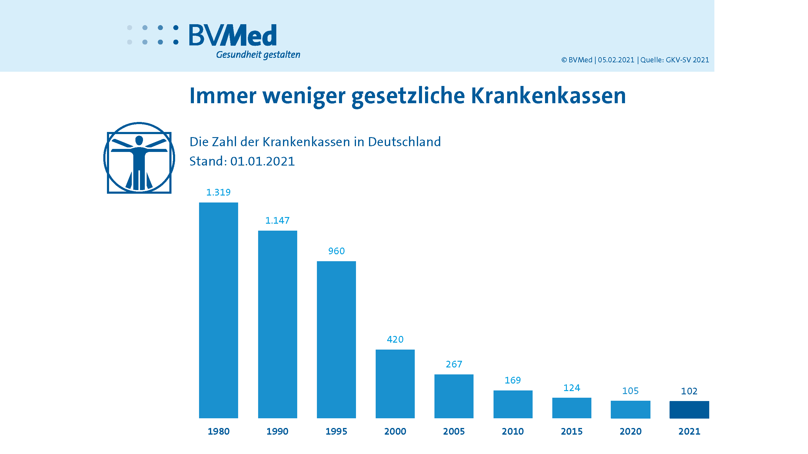 Die Zahl der gesetzlichen Krankenkassen in Deutschland ist in den letzten 40 Jahren stark zurückgegangen: Von 1.319 Kassen im Jahr 1980 auf 105 Kassen Anfang 2020.