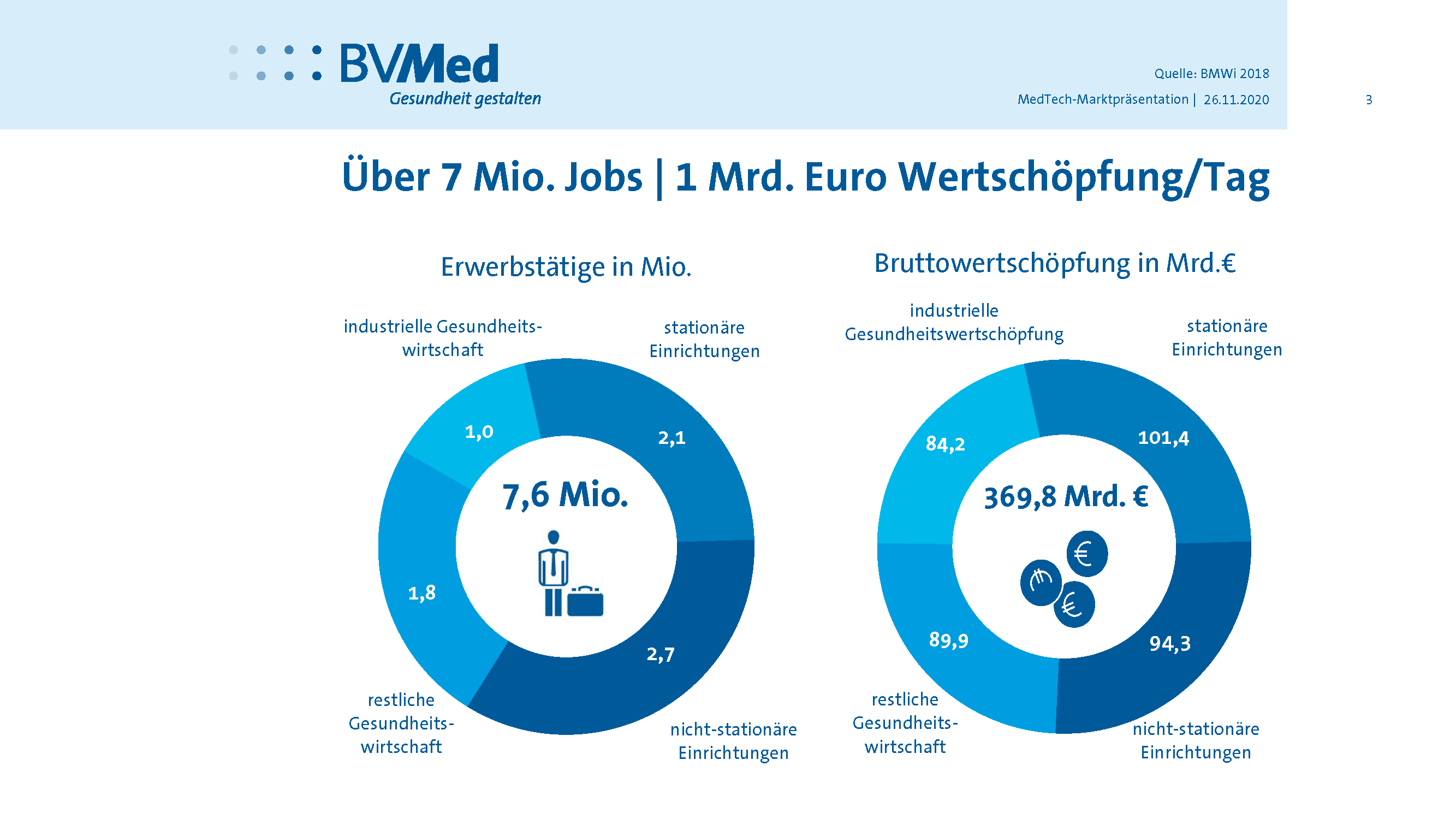 Die deutsche Gesundheitswirtschaft beschäftigt 7,6 Millionen Menschen und erwirtschaftet knapp 370 Milliarden Euro. Das entspricht einem Anteil von 12,1 Prozent am Bruttoinlandsprodukt. Damit entsteht jeder achte Euro Bruttowertschöpfung in Deutschland in der Gesundheitswirtschaft. Die Gesundheitswirtschaft ist seit 2007 nominal in jedem Jahr gewachsen. Auch 2009, einem Jahr der Finanzkrise, verzeichnete sie ein positives Wachstum. Das geht aus einer Untersuchung des Wirtschaftsforschungsinstituts WifOR im Auftrag des Bundesministeriums für Wirtschaft und Energie (BMWi) hervor, die im Mai 2019 in Berlin vorgestellt wurde (Download unter www.bvmed.de/branchenstudien).