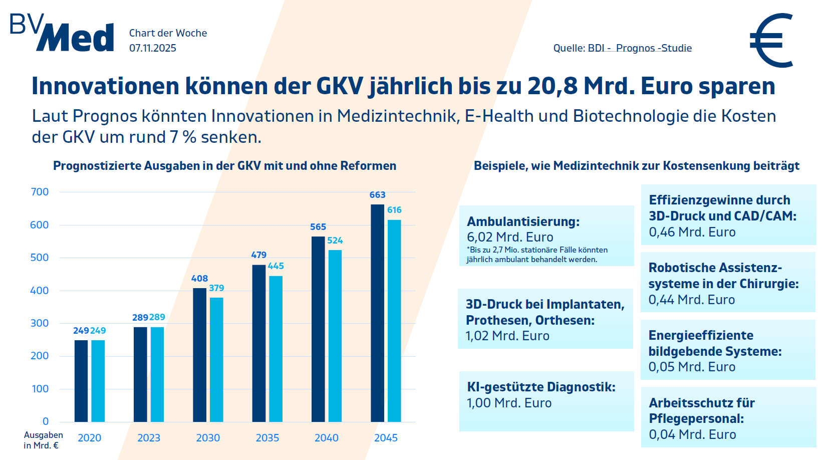Die Prognos-Studie im Auftrag von BDI zeigt: Durch gezielte Investitionen in Medizintechnik, E-Health und Biotechnologie könnten die Ausgaben der gesetzlichen Krankenversicherung wesentlich gesenkt werden.