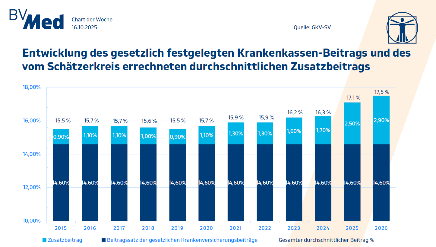 Die Zusatzbeiträge zur gesetzlichen Krankenversicherung werden 2026 aufgrund einer angespannten Finanzlage um 0,4 Prozentpunkte auf 2,9 Prozent steigen, was den Gesamtbeitragssatz auf 17,5 Prozent anheben wird.