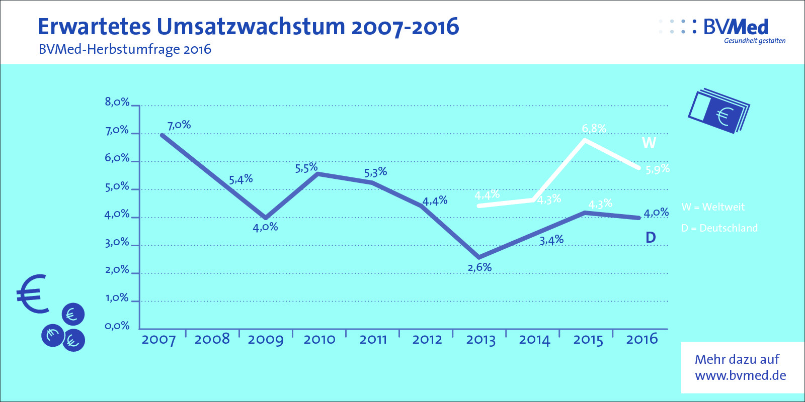 Die Unternehmen der Medizintechnologie sind nach wie vor sehr erfolgreich im Export. Das Wachstum liegt hier bei rund 6 Prozent. Die Entwicklung im inländischen Markt ist dagegen mit einem Umsatzwachstum von 4 Prozent leicht rückläufig.