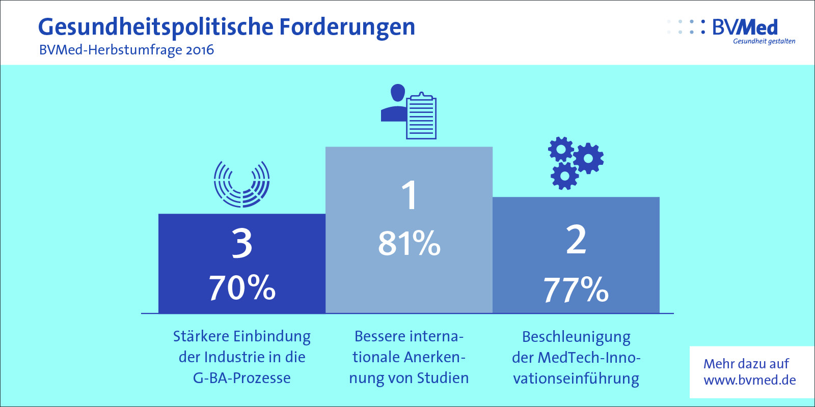 Bei den gesundheitspolitischen Forderungen wünschen sich die MedTech-Unternehmen vor allem eine bessere gegenseitige Anerkennung von Studien im Rahmen der Nutzenbewertung von Medizintechnologien. 81 Prozent der Unternehmen bezeichnen diesen Aspekt als „sehr wichtig“ bzw. „eher wichtig“. Weit oben auf der gesundheitspolitischen Agenda stehen weiterhin die Beschleunigung der Innovationseinführung (77 Prozent) und die Forderung nach einer stärkeren Einbindung der Industrie in die G-BA-Prozesse (70 Prozent).