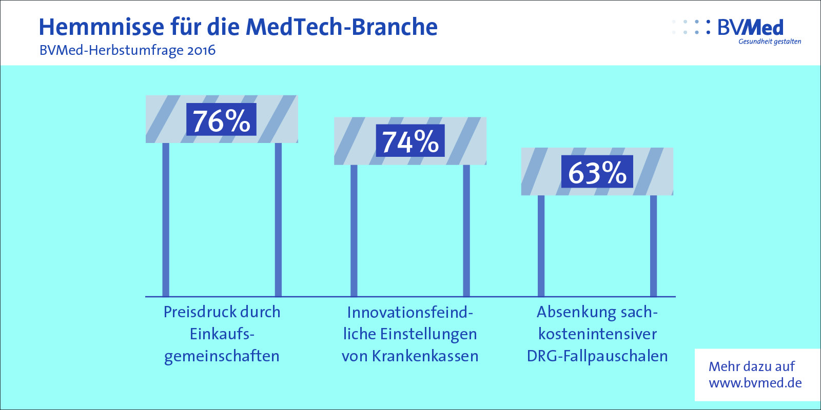 Als größte Hemmnisse der aktuellen Rahmenbedingungen in Deutschland werden von den MedTech-Unternehmen der Preisdruck durch Einkaufsgemeinschaften und innovationsfeindliche Einstellungen von Krankenkassen genannt. 76 bzw. 74 Prozent beurteilen diese Hemmnisse als „sehr wichtig“ bzw. „eher wichtig“.