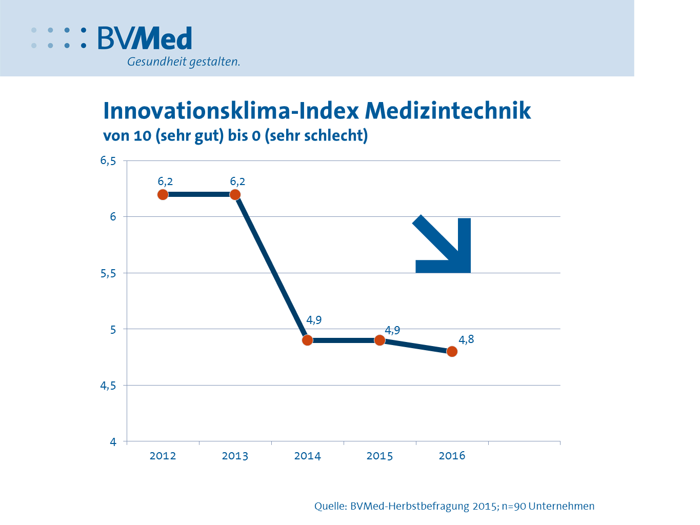 Auf einer Skala von 0 (sehr schlecht) bis 10 (sehr gut) bewerten die Unternehmen das Innovationsklima für Medizintechnik in Deutschland im Durchschnitt mit 4,8. Der Index 2016 ist damit gegenüber dem Vorjahr (4,9) leicht rückläufig. In den Jahren 2012 und 2013 lag er noch bei 6,2 Punkten.