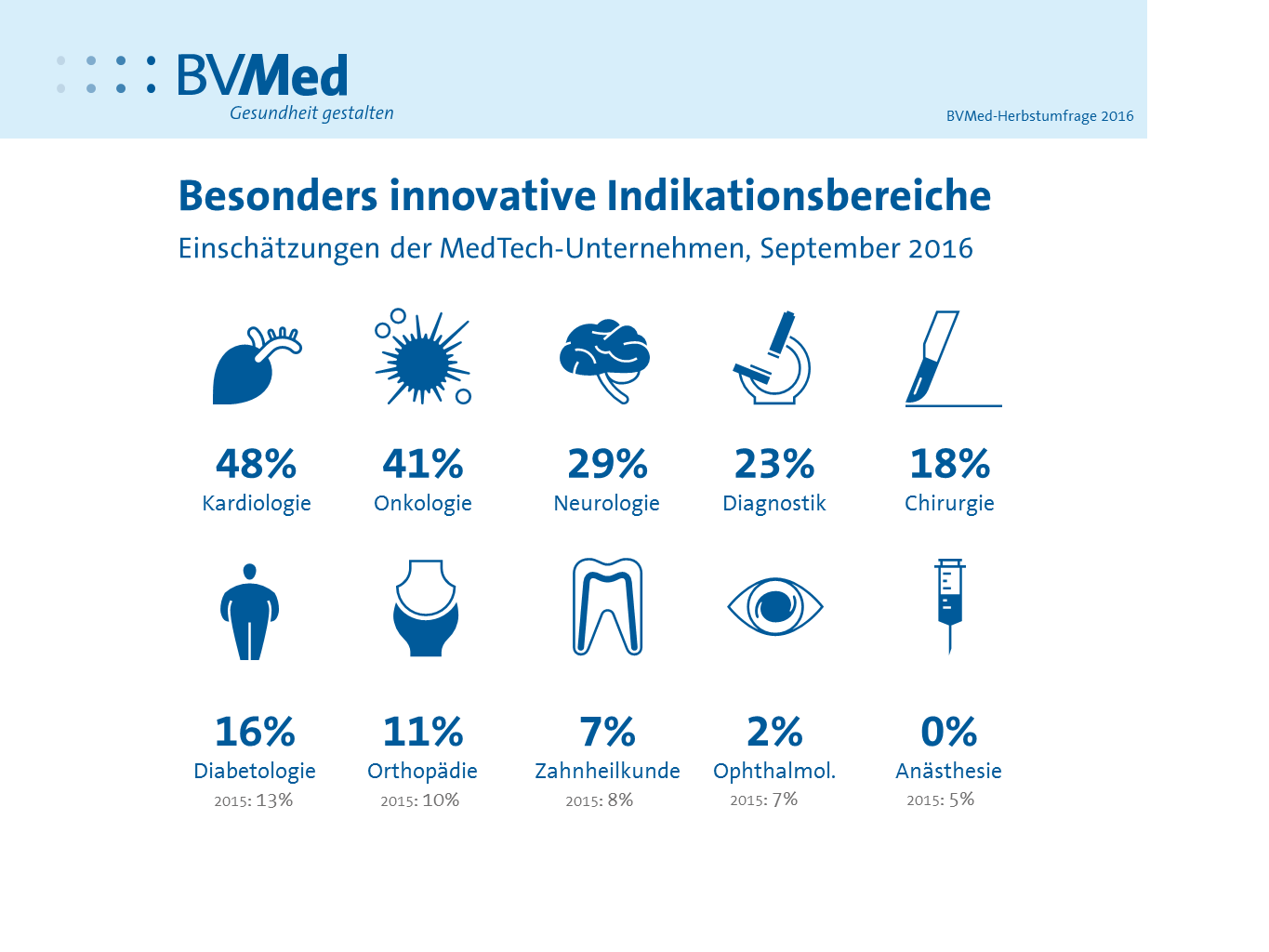 Als innovativsten Forschungsbereich schätzen die Unternehmen – wie im Vorjahr – die Kardiologie ein. 48 Prozent der Befragten nennen diesen Versorgungsbereich. Es folgen Onkologie (41 Prozent), Neurologie (29 Prozent), Diagnostik (23 Prozent), Chirurgie (18 Prozent), Diabetologie (16 Prozent) und Orthopädie (11 Prozent).