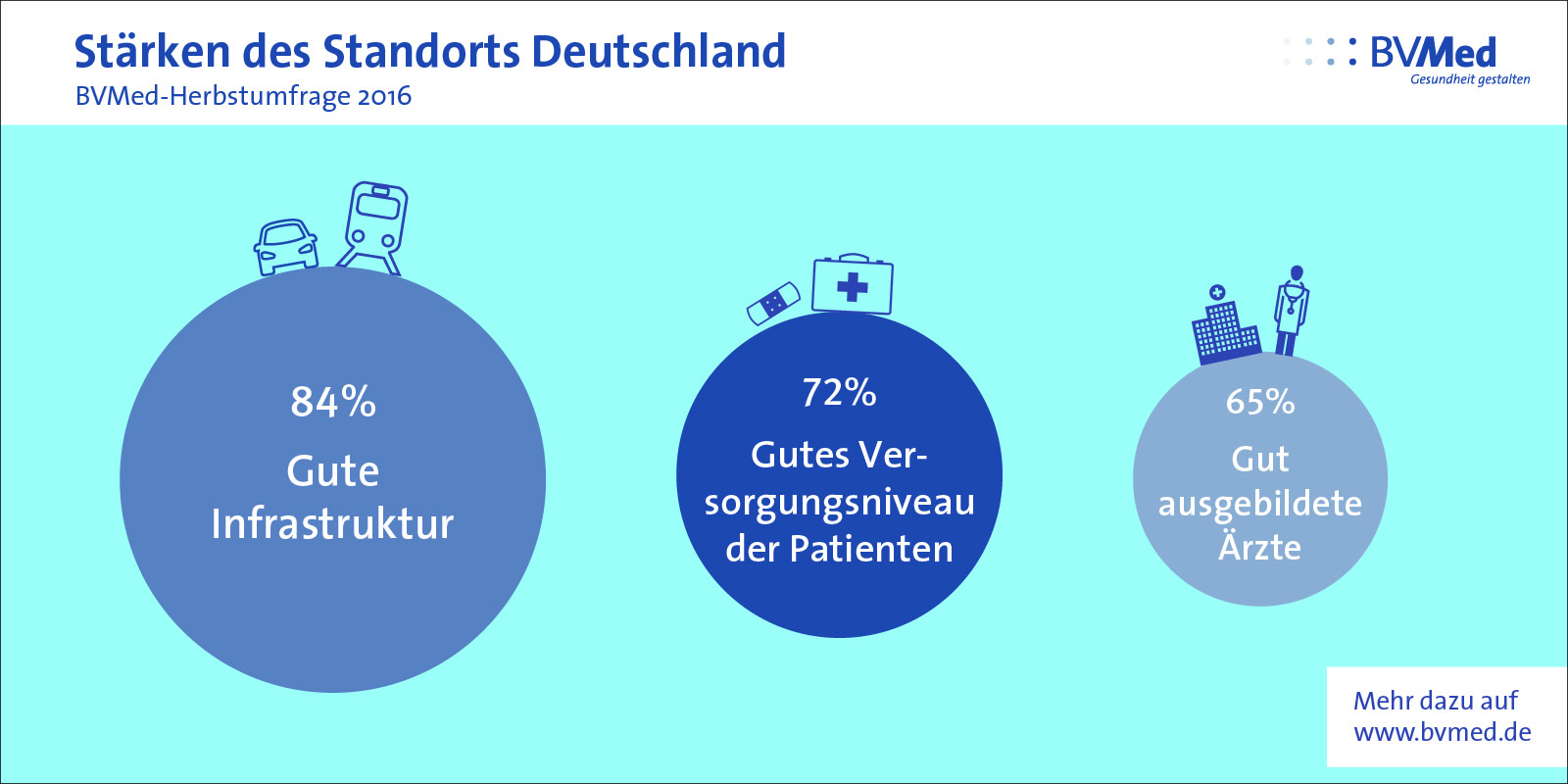 Als größte Stärke des Standorts Deutschland nennen die befragten MedTech-Unternehmen die im Land vorhandene Infrastruktur, beispielsweise die Verkehrswege. 84 Prozent bezeichnen diesen Aspekt als „sehr gut“ bzw. „gut“. Auch das hohe Versorgungsniveau der Patienten (72 Prozent) und gut ausgebildete Ärzte (65 Prozent) werden positiv beurteilt.