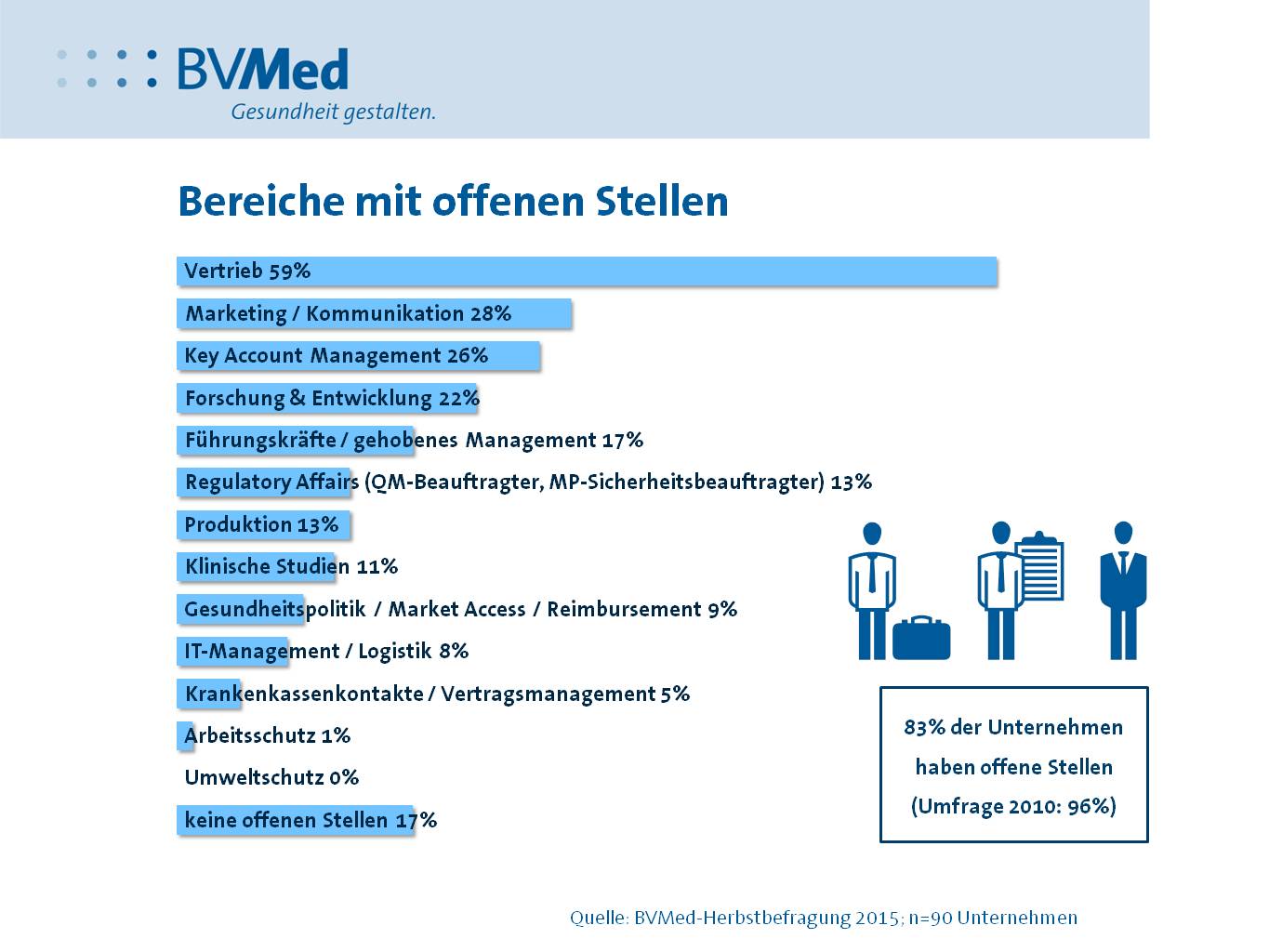 Laut BVMed-Herbstumfrage 2015 haben 83 Prozent der befragten Firmen offene Stellen. Gesucht wird primär im Vertrieb, in Marketing und Kommunikation sowie im Key Account Management.