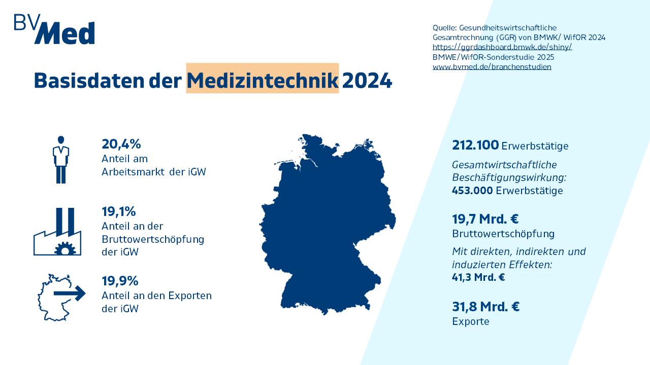 Die BMWE/WifOR-Sonderstudie 2025 zeigt: Die MedTech-Branche zählt zu den innovations- und exportstärksten Sektoren der deutschen Wirtschaft. Im Jahr 2024 wurde eine direkte Bruttowertschöpfung von 19,7 Milliarden Euro erzielt, die über direkte, indirekte und induzierte Effekte auf 41,3 Milliarden Euro anstieg. Ebenso beeindruckend ist die gesamtwirtschaftliche Beschäftigungswirkung mit rund 453.000 Erwerbstätigen.