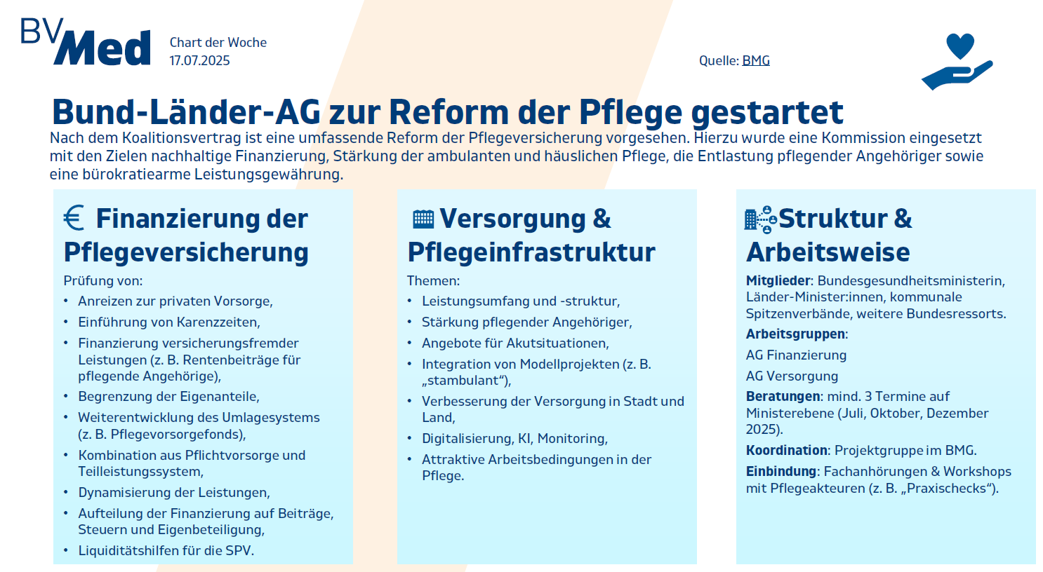 Nach dem Koalitionsvertrag ist eine umfassende Reform der Pflegeversicherung vorgesehen. Hierzu wurde eine Kommission eingesetzt mit den Zielen nachhaltige Finanzierung, Stärkung der ambulanten und häuslichen Pflege, die Entlastung pflegender Angehöriger sowie eine bürokratiearme Leistungsgewährung.