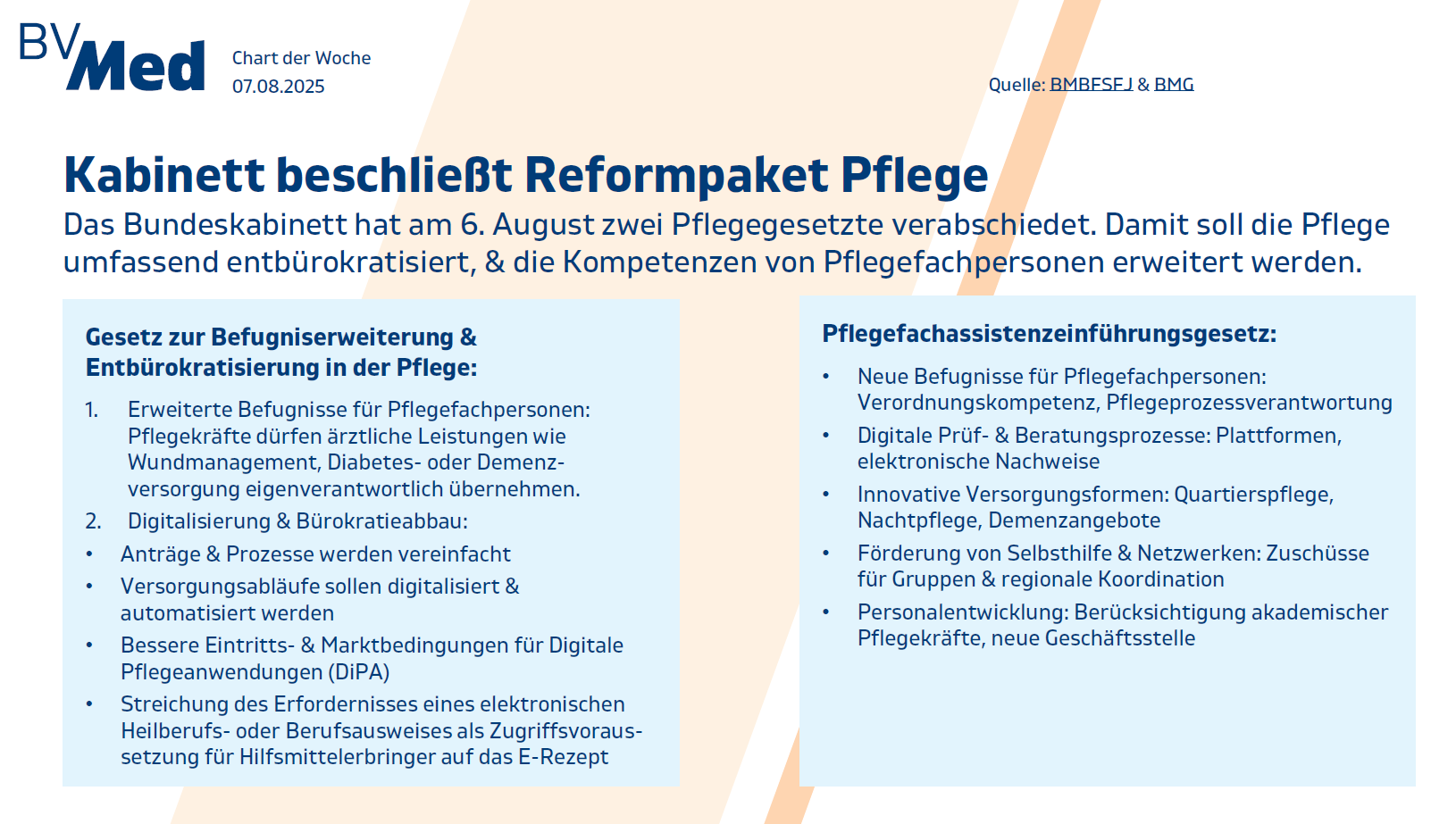 Das Bundeskabinett hat am 6. August zwei zentrale Pflegegesetze verabschiedet: das Pflegefachassistenzeinführungsgesetz und das Gesetz zur Befugniserweiterung und Entbürokratisierung in der Pflege.