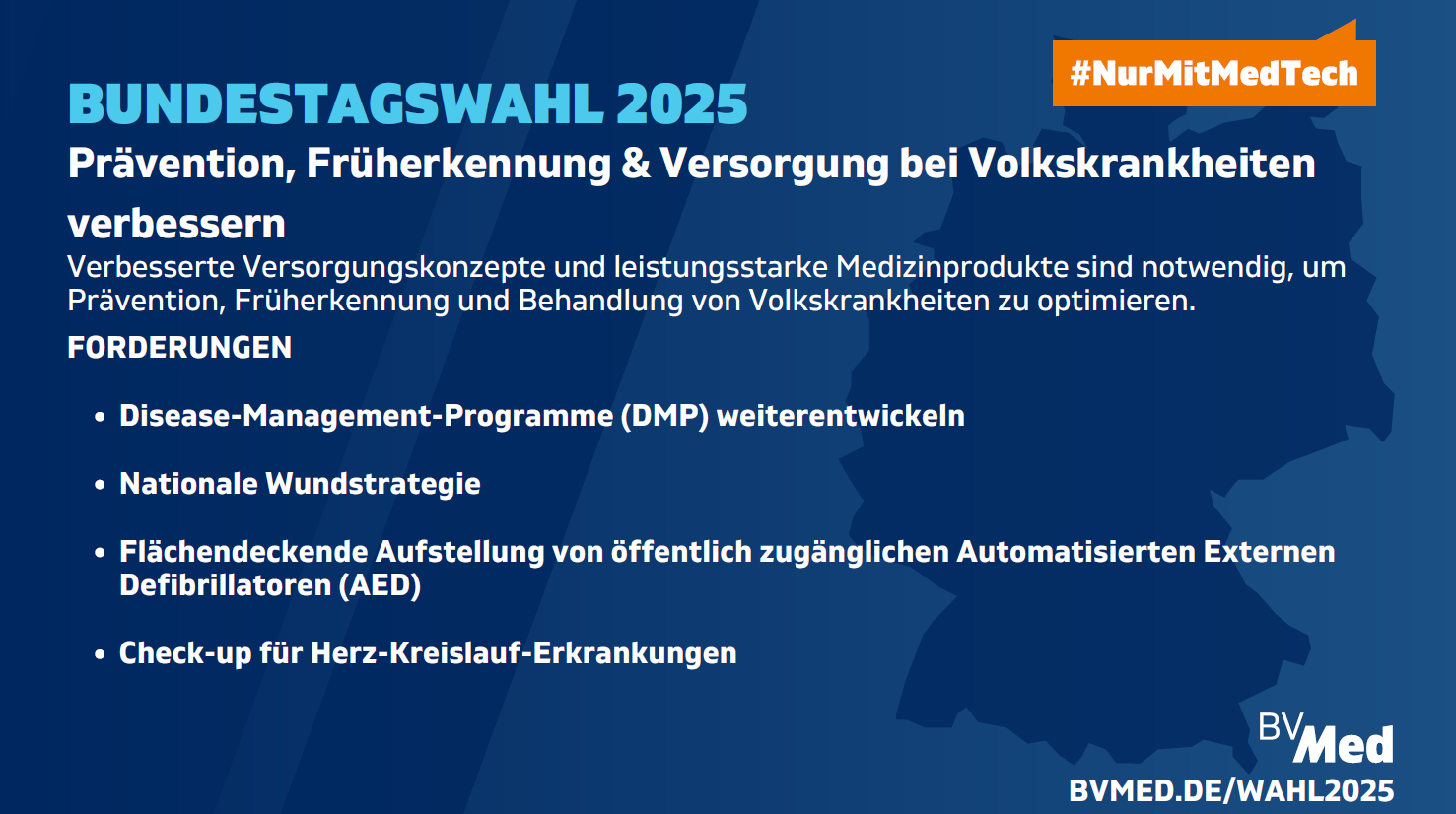 Wir benötigen bessere Versorgungskonzepte für Volkskrankheiten wie Herz-Kreislauf-Erkrankungen, Diabetes, Adipositas und Krebs. Denn wir sind in der Versorgung in Deutschland leider nur Mittelmaß. Verbesserte Prävention, Früherkennung und Behandlung sind dringend notwendig, um die Krankheits- und Todeszahlen signifikant zu reduzieren.