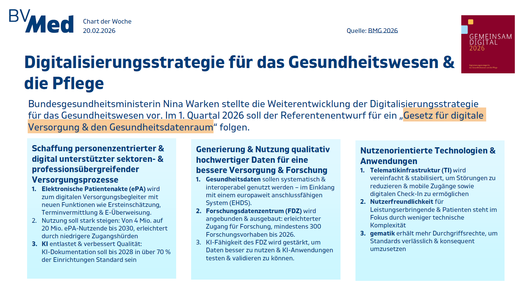 Bundesgesundheitsministerin Nina Warken stellte die Weiterentwicklung der Digitalisierungsstrategie für das Gesundheitswesen vor. Im 1. Quartal 2026 soll der Referentenentwurf für ein „Gesetz für digitale Versorgung & den Gesundheitsdatenraum“ folgen.
